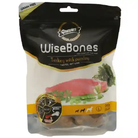 Gnawlers WiseBones Pavo con Perejil de 15ud se utiliza como un suplemento para la alimentación que satisface las necesidades diarias de sus perros. Es un tratamiento saludable que se ha creado teniendo en cuenta las distintas necesidades nutricionales del perro. Se compone de ingredientes de alta calidad, equilibrados y de fácil digestión que contribuyen al bienestar general del canino. Masticarlos también mejoraría la salud dental del perro. Una alternativa de masticación saludable, estos palitos para masticar seguramente le encantarán a su mascota. Los snacks para perritos son la mejor manera de recompensar a tu mascota tras un buen comportamiento. También si disfrutas de verle súper feliz a la hora de comer, o como postre. Las mejores golosinas para perro son a base de una nutrición enriquecida en fibra y vitaminas. De la misma manera las mejores marcas ayudan a la limpieza dental de tu mascotita y son elaboradas de productos naturales. Premia a tu perro con este snack Beneficios de WiseBones Pavo con Perejil Apto para todas las razas de perros. Snack saludable y sabroso para tu mascota. Ayuda a mantener huesos y músculos fuertes, mejora los problemas digestivos y limpia los dientes. Promover la salud de la piel y el pelaje.