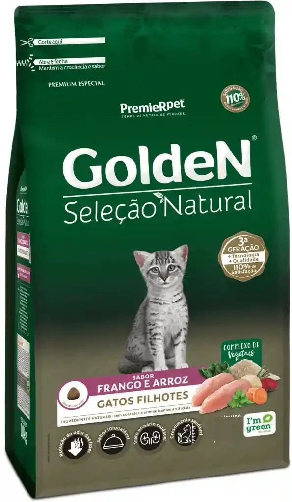 GoldeN Selección Natural Gatos Gatitos Sabor Pollo y Arroz Atenta a las tendencias del mercado y a las exigencias de nuestros clientes, PremieRpet® lanzó la nueva línea GoldeN Selección Natural, un alimento Premium Especial que mantiene la reconocida calidad de la Familia GoldeN. Una línea completa de productos creada a partir de la rigurosa selección y control de materia prima y formulada con ingredientes exclusivos. Contiene complejo de 6 vegetales, como fuente de fibras y sales minerales, bajo nivel de sodio para resaltar el sabor natural de los ingredientes, sin colorantes o saborizantes artificiales y sin ingredientes transgénico. La línea GoldeN Selección Natural es la mejor elección para que tu mascota tenga una alimentación de acuerdo con tu estilo de vida. GoldeN Selección Natural, saludable como tu estilo de vida.