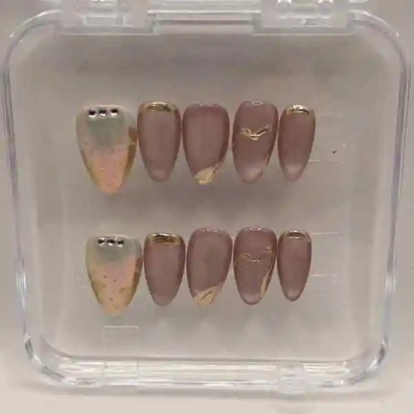 Uñas hechas a mano en color nude y dorado metálico con detalles en glitter y pedrería. Forma: Almendra, Talla: S Kit Incluye: 10 uñas, 24 stickers, lima, palo de cuticula, alcohol pad. 100% veganas, libres de crueldad animal, listas en 10min y duran hasta 2 semanas.