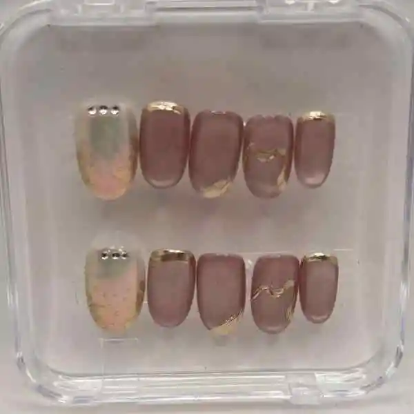 Uñas hechas a mano en color nude y dorado metálico con detalles en glitter y pedrería. Forma: Ovalada, Talla: M Kit Incluye: 10 uñas, 24 stickers, lima, palo de cuticula, alcohol pad. 100% veganas, libres de crueldad animal, listas en 10min y duran hasta 2 semanas.
