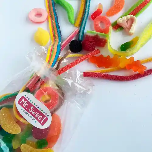 Surtido de gomitas dulces azucaradas y ácidas. Productos sin gluten