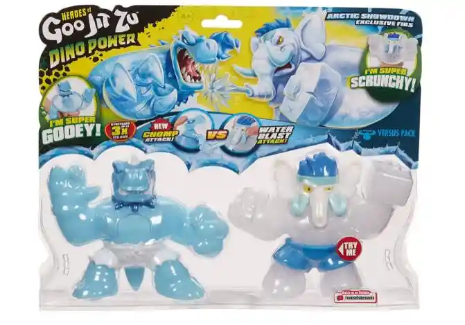 El Arctic Showdown Versus Pack está diseñado para ser una batalla directamente desde el primer momento. Incluye 2 Heroes of Goo Jit Zu para estirar, luchar y jugar. Arctic Showdown Tyro y Gigatusk tienen un aspecto de hielo único y exclusivo exclusivo de este paquete.Tyro es súper pegajoso, aprieta su cuerpo y observa cómo su relleno transparente y blando se abulta para revelar los dientes de dinosaurio dentro de él. Aprieta su cuerpo y aprieta sus entrañas.Tyro cuenta con la nueva función "Ataque Chomp", mientras que el redback Gigatusk tiene el ataque Water Blast ¿Quién ganará? Tanto Tyro como Gigatusk pueden estirarse y aplastarse. Siempre volverán a su forma original! Pueden estirarse hasta 3 veces su tamaño. Se recomienda de 3 años en adelante.