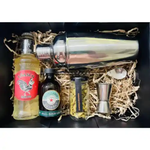 Caja Premium imantada Negra + 01 Tónica Italiana J. Gasco + 01 Gin Quintal 4Oz. + 01 Frasco de Botanicos Go Barman + 01 Set de Barman: Coctelera, Yigger y Cuchara acero inoxidable