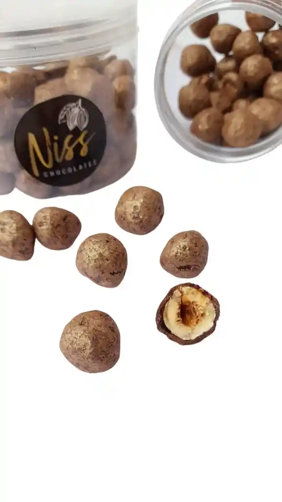 Deliciosas avellanas europeas caramelizadas y cubiertas con chocolate semi amargo 56% de cacao. Además, están pigmentadas con un leve toque oro.