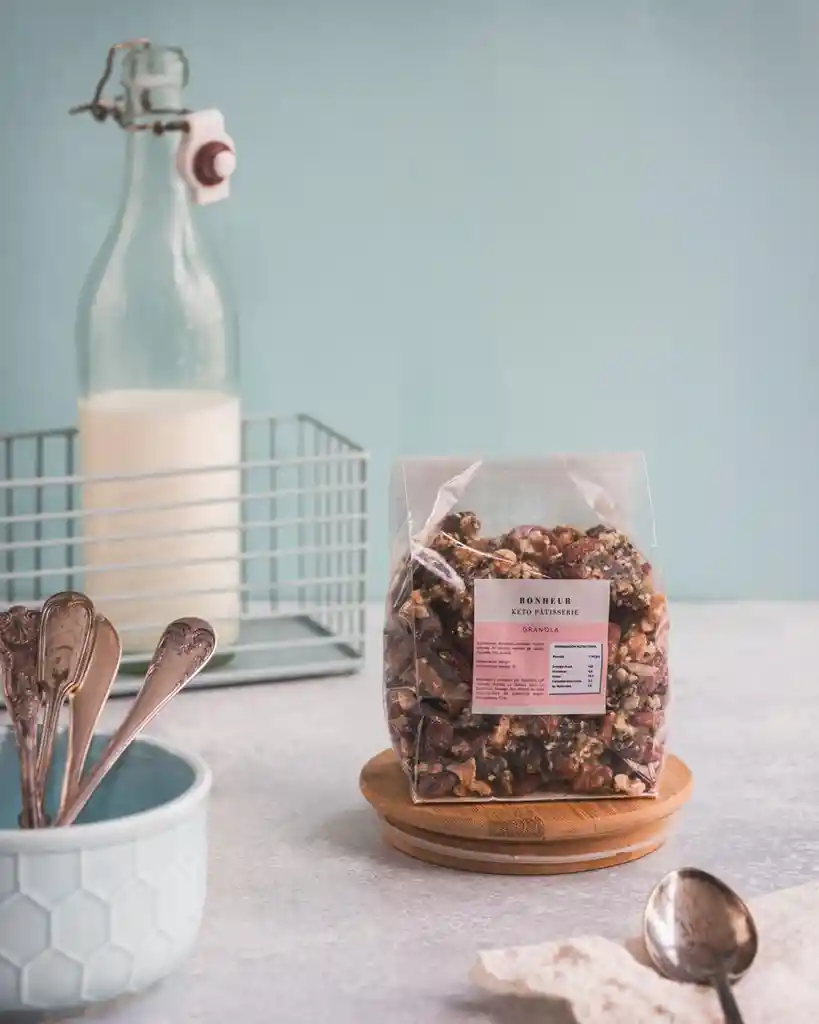 Presentación: 300 grs Deliciosa granola de elaboración propia caramelizada con alulosa elaborada en base a almendras, avellanas europeas, nueces, semillas de sesamo, semillas de zapallo, maravilla, chia, Aceite de coco y alulosa. Acompáñala con tu yogurt o ensalada favorita y dale esa crocancia irresistible! Sin gluten, sin azúcar, sin lácteos, vegana, keto. - 300 grs