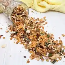La granola con semillas es una mezcla energética de avena, frutos secos, semillas (chía, lino, girasol, calabaza) y endulzante, horneada hasta quedar crujiente, ideal para desayunos o snacks saludables con yogur, leche o frutas, aportando fibra, proteínas y grasas saludables