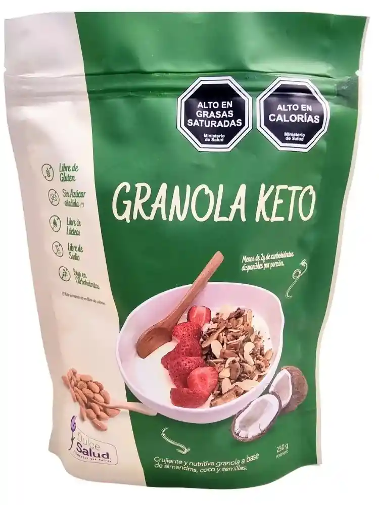 Granola Keto crujiente y nutritiva baja en carbohidratos, elaborada con frutos secos, semillas y aceite de oliva extra virgen. La mejor alternativa para tus desayunos y snacks keto, con solo 1,7 g de carbohidratos disponibles por porción. Keto / Low Carb – Vegana – Libre de azúcar añadida – Libre de gluten – Libre de soya. Envase 100% reciclable con 250 g de producto listo para consumir.