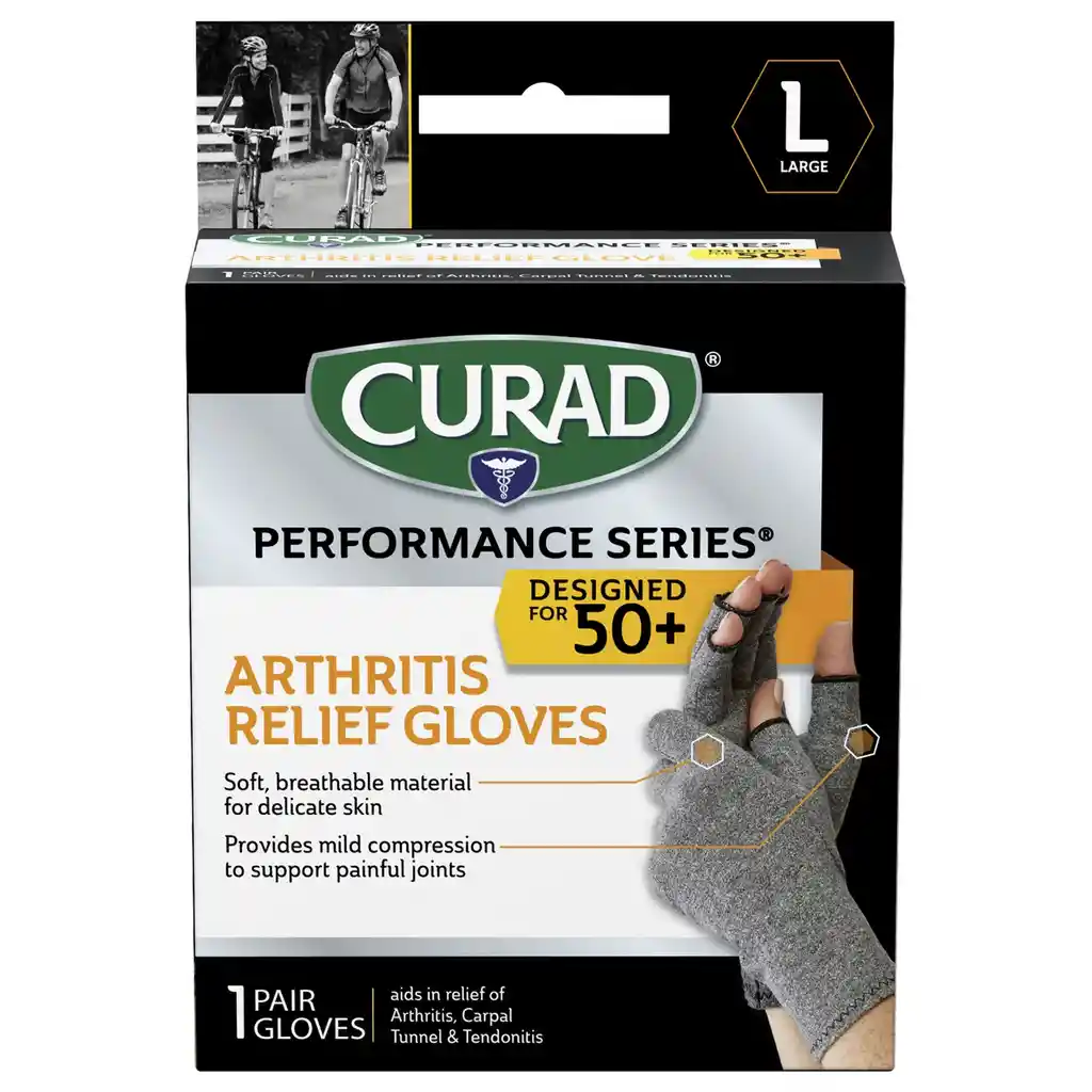 Talla L ¿Qué hace que los guantes de alivio de artritis Performance Series 50 + sean tan efectivos? AYUDA CON ARTRITIS, TÚNEL DE CARPAL Y TENDONITIS: la compresión leve soporta las articulaciones dolorosas, lesiones y afecciones comunes MATERIAS SUAVES Y RESPIRABLES GRANDES PARA EL CONFORT Y LA PIEL MAYOR: elimina el sudor mientras evita que las abrasiones y las pieles rasguen DISEÑADO PARA 50 + SENIORES ACTIVOS PARA HACER APLICACIÓN MÁS FÁCIL: la construcción acomodaticia significa una incomodidad mínima al usar, ajustar o quitar este producto. PROTECCIÓN PARA PREVENIR LOS PUERTOS BACTERIALES: la tecnología Microban * desalienta el crecimiento de bacterias decolorantes y causantes de olores. ¿Por qué CURAD Performance Series 50+? Recuperación rápida: esguinces, tensiones, inestabilidad y dolores cotidianos hacen que sea vital encontrar el apoyo adecuado para ayudarte a recuperarte y seguir moviéndose. Respetuoso con la piel: a medida que envejecemos, la piel se vuelve más delgada, pierde elasticidad y es más propensa al secado y la irritación. Nuestros materiales son suaves, flexibles y transpirables para poner menos estrés en la piel. Fácil destreza – cuando los dedos y las manos no son tan fuertes y flexibles como solían ser, grandes bucles y pestañas fáciles de agarrar hacen que sea más fácil de aplicar, ajustar y quitar tus soportes. Sin esfuerzo de poner: ventajas como asas de ajuste grandes con una sola mano y diseños envolvente, ayudan a fijar y ajustar cómodamente su soporte de más de 50 años sin torsión ni doblarse.