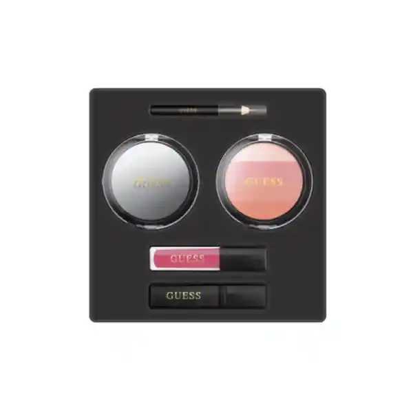 Set Guess Contiene 5 Unidades. Delineador de Ojos 1 Und + Máscara de Pestañas 1 Und + Labial 1 Und + Rubor 2 Und.