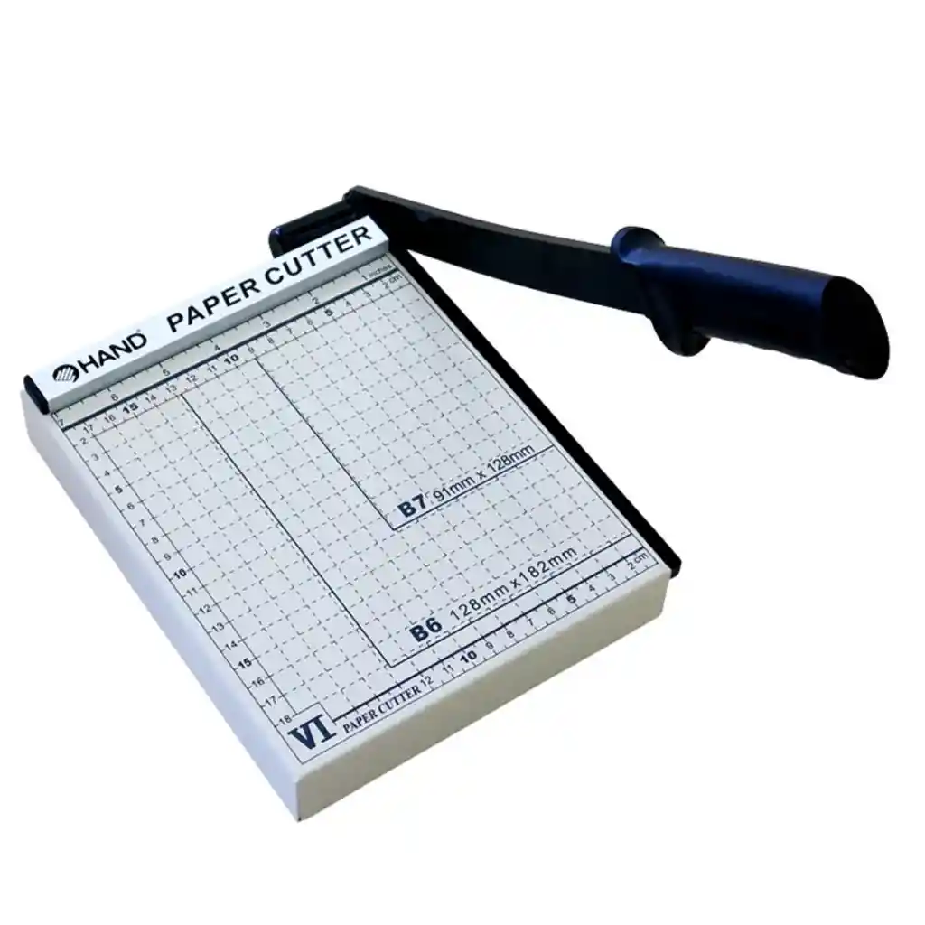Base de metal, cuchilla recta, para 10 hojas de papel. Sin guía de corte. Tamaño: 18 x 20cm.