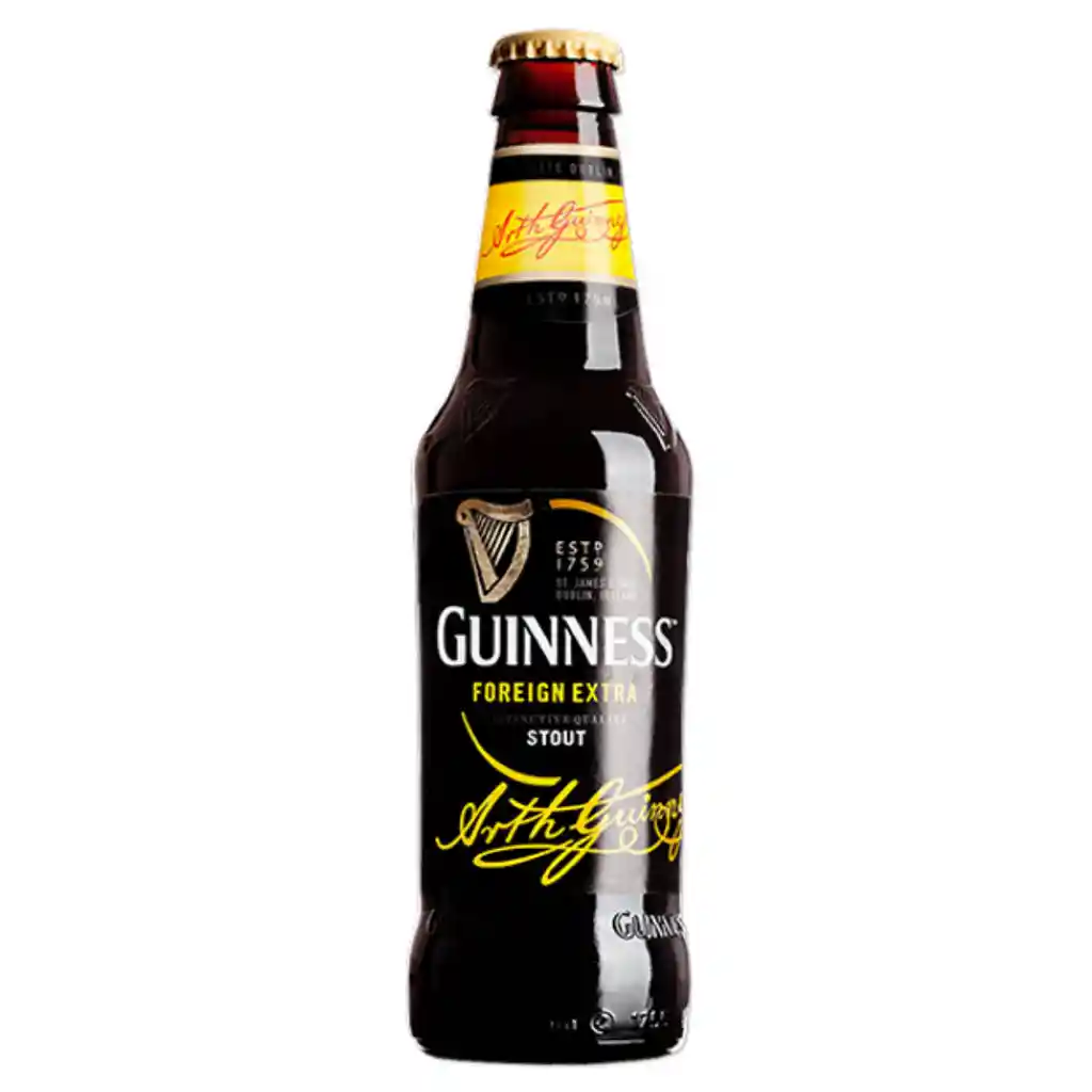 Guinness Foreign Extra Stout (formato botella, 330ml). Con sus 7,5% vol. alc. es la variedad más fuerte, de cuerpo robusto y sabores a malta tostada. Su receta se remonta a 1801, cuando Arthur Guinness II comenzó a enviar su "West Indian Porter" a territorios lejanos alrededor del mundo. Para sortear los viajes, a veces de varias semana o atravesando climas tropicales, se añadió a esta Porter mayores cantidades de lúpulos para preservar la calidad de la cerveza. Así, se dio vida a esta nueva receta!