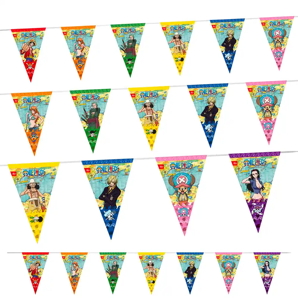 Cantidad: 1 guirnalda banderín Material: Papel Diseño: Ilustraciones de One Piece Medida total: 2 metros de largo aprox.