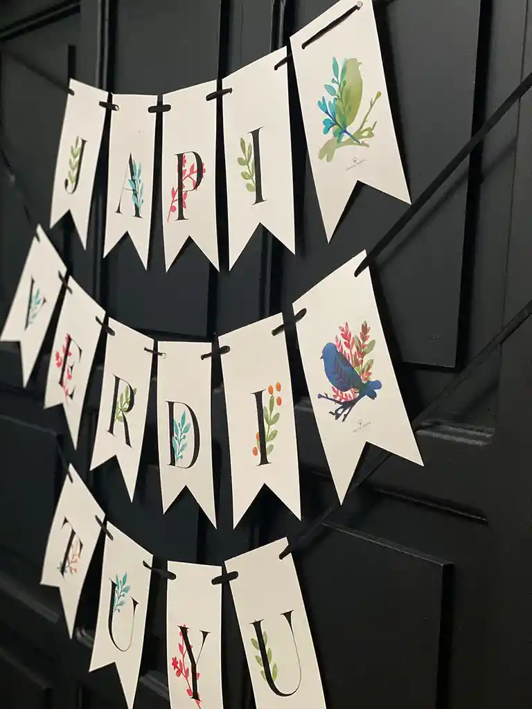Guirnalda de Papel Texto: Japi Verdi tu Yu Impreso en Papel pearl 280g. 10 m. cinta de raso.
