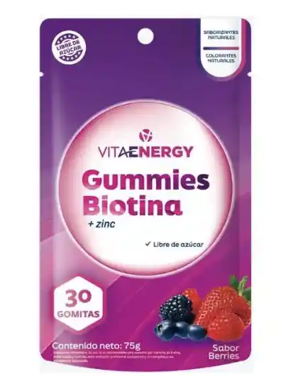 Cuida tu cabello, uñas y piel con nuestras deliciosas Gummies Biotina + Zinc. Libres de azúcar, con exquisito sabor a berries. ¡Pruébalas ahora! Las Gummies Biotina + Zinc Vitaenergy son la forma más rica y práctica de cuidar tu cabello, uñas y piel desde el interior. Cada gomita tiene una combinación ideal para mantener la estructura capilar, prevenir la caída del cabello y fortalecer uñas quebradizas. Con un exquisito sabor berries, libres de azúcar y libres de colorantes y saborizantes artificiales. La biotina contribuye a conservar la salud del cabello, reduciendo la rotura y la caída, además de participar en el metabolismo energético que promueve la regeneración celular. Por su parte, el zinc actúa como antioxidante, favorece la cicatrización de la piel y participa en la síntesis de proteínas, necesarias para el crecimiento de cabello y uñas. Modo de consumo: Consume 1 gomita al día