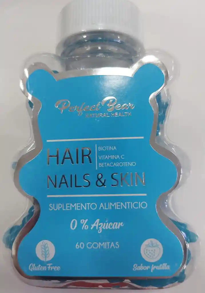 Hair, Nails Skin ¡Transforma tu rutina de cuidado personal con Hair, Nails, Skin de Perfect Bear: el suplemento en gomitas que elevará tu belleza desde adentro hacia afuera! Con una combinación de vitaminas y minerales 100% naturales, estas exquisitas gomitas están diseñadas para fortalecer tu cabello, uñas y piel. Hair, nails skin es un osito masticable de exquisito sabor, fortificado con vitaminas y minerales 100% naturales, cuidadosamente seleccionadas especialmente para fortalecer tu cabello y uñas, esta vez con una porción extra de betacaroteno que contribuye a la protección de las células de la piel contra el daño oxidativo, estimula las funciones normales del sistema inmunológico y beneficia la salud de la piel. La biotina es la principal vitamina que contribuye a mantener el cabello sano, con volumen y fuerte, disminuyendo a la vez la caída. Las vitaminas más importantes para los procesos metabólicos del cabello, son las del complejo B, que además ayudan en la producción de queratina, principal proteína de las uñas, de esta forma contribuye en el fortalecimiento de las uñas débiles. El betacaroteno es un precursor natural de la vitamina A que ayuda a mantener las funciones normales de la piel, potente antioxidante que mantiene la piel tersa y saludable, además de humectada porque interviene directamente en los pigmentos de la piel.