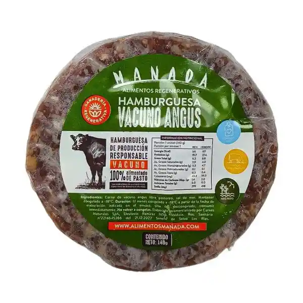 Hamburguesas de carne de vacuno Angus criado libre en praderas del sur de Chile, alimentado exclusivamente de pastos naturales (libres del uso de fertilizantes químicos y pesticidas). Respetamos el ciclo de vida del animal sin utilizar hormonas o antibióticos para generar una ganancia en el peso. El empaque completo de este producto es 100% reciclable, y el film que cubre la smash burger es compostable. Ingredientes: 100% carne y sal de mar (1gr). Algunos atributos: ✅ Libre de sellos. ✅100% carne de vacuno Angus. ✅ Producida bajo Ganadería Regenerativa. ✅ De animales criados libres del uso de hormonas o antibióticos. ✅Todos los materiales de su packaging 100% reciclables/compostables 🙌 Formato: Hamburguesa de 120 gr congeladas.