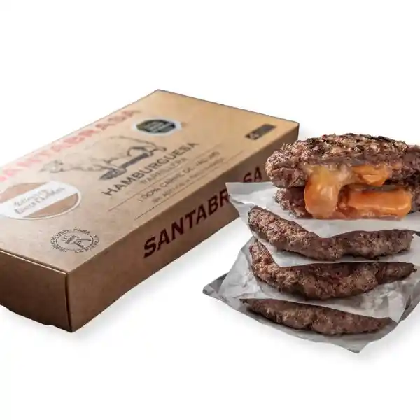 Hechas por Santa Brasa Deliciosas hamburguesas 100% Res rellenas de queso Cheddar. Empaque congelado de 4 unidades. 180 gramos cada hamburguesa
