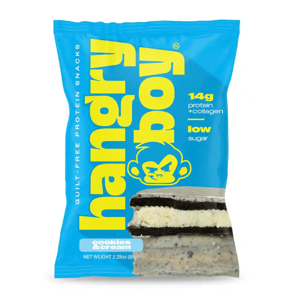Hangryboy Snack Alfajor llega con una novedosa y deliciosa galleta tipo alfajor que están horneadas, contiene un centro cremoso y aportan 14 g de proteína. Apoya tu nutrición diaria y están hechas para matar esos antojos.