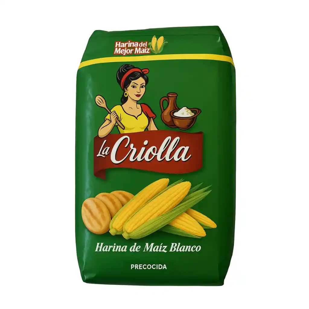 Harina de Maíz blanco precocida La Criolla 1kg, perfecta para arepas, empanadas y más. Calidad y sabor auténtico.