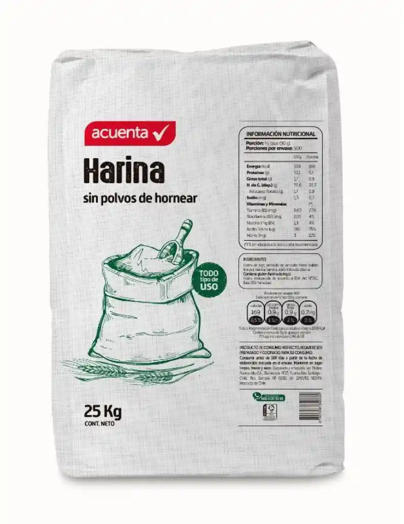 Harina sin polvos de hornear todo tipo de uso Acuenta. Presentación: 1 bolsa por 25 kg.