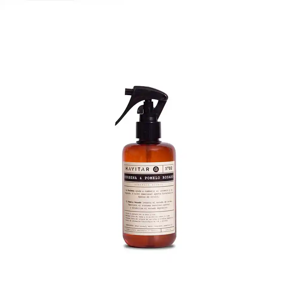 Aroma: Nº 2 Verbena Pomelo Rosado. Familia olfativa: Cítrica Notas olfativas: notas de salida cítricas, pomelo rosado, fragancia floral verbena. Características: Envase: PET ambar Contenido: 250 ML Uso: Ambiental y textil