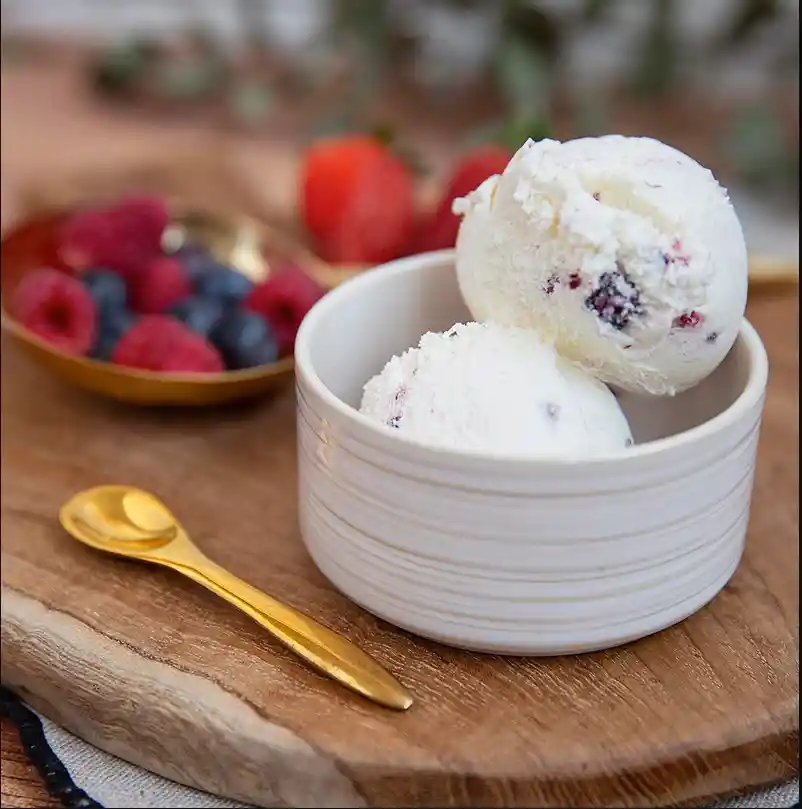 Helado de queso Mascarpone sembrado con arándanos, frambuesas, frutillas y mora Tamaño: 1 litro / Libre de gluten