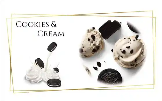 Helado con una base de suave y ligera de crema, junto con incrustaciones de trozos de galletas Oreo, nos lleva a un helado minimalista en sus ingredientes pero diverso en los recuerdos que nos puede generar desde nuestra infancia hasta el presente. Su sabor sutil en contraste con la galleta, permite combinarlo con sabores frutales y otros ingredientes.