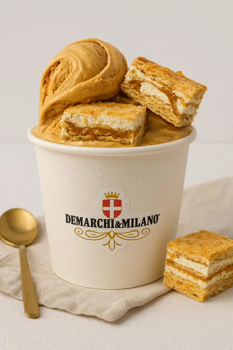 Elaborado con nuestra base blanca artesanal y auténtico dulce de leche argentino, se crea una mezcla cremosa y de sabor compacto, complementando esta maravillosa mezcla, con trozos de nuestra propia torta de mil hojas y dulce de leche, creando una fusión perfecta de cremosidad y crocancia que aporta la mil hoja.