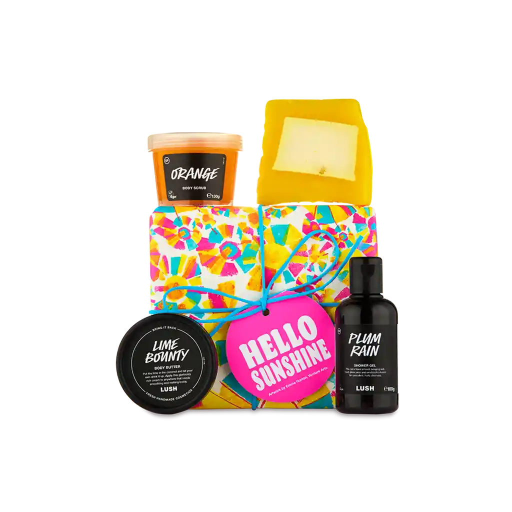Consigue una sensación fresca y soleada con estas cuatro delicias frutales para el cuerpo y la ducha que contiene el regalo Hello Sunshine.