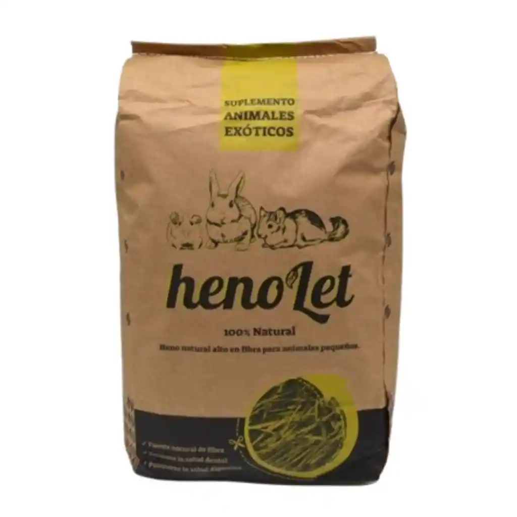 Heno Let, constituye una parte esencial de la alimentación diaria de pequeños animales. Su alto contenido de fibra ayuda a mantener un aparato digestivo saludable estimulando el sistema gastrointestinal (motiidad) y es una fuente importante de vitaminas y minerales. Además evita el aburrimiento y favorece la salud dental ayudando en el desgaste de sus dientes. También se recomienda como material de cama para tu mascota. Recomendado por Médicos Veterinarios especialistas en animales exóticos. Dale acceso ilimitado al alimento y asegura de que tu mascota consuma grandes cantidades de heno todos los días. La cantidad de alimento a ofrecer dependerá del tamaño del animal. Puedes colocar el heno en un recipiente en forma de tolva o cubo, o dejarlo suelto en el fondo de la jaula. Es preferente la creatividad y así incentivar el consumo de heno. Puedes esconderlo en el interior de algún juguete inocuo, tubo de cartón o un juguete especial como nuestro. Características Heno 100% natural extraído de cultivos de alfalfa. El envase de cartón trae un sector para recortar y para colocar directamente para que tu mascota saque la cantidad que requiere. Apto para conejos, conejillos de indias o cuy y chinchillas. Almacena en un lugar fresco y seco, libre de plagas e insectos. Empuja suavemente el aire de la bolsa y vuelve a cerrar después de cada uso. % Nutricional Proteína cruda: min 7.0%. Grasa cruda: min 1.8% Fibra cruda: max 32%. Humedad: max 12%