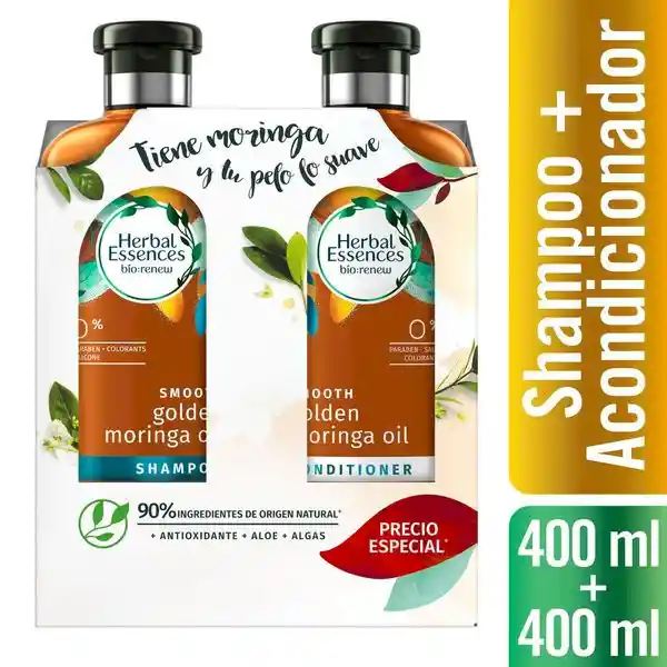 El Shampoo Para Cabello Herbal Essences Golden Moringa Oil se ha Elaborado Especialmente a Partir de Ingredientes Inspirados en la Naturaleza Para Conseguir un Cabello Suave y Más Manejable. el Acondicionador Para Cabello Herbal Essences Golden Moringa Oil se ha Elaborado Especialmente a Partir de Ingredientes Inspirados en la Naturaleza Para Conseguir un Cabello Suave, Brillante y Más Manejable. Este Acondicionador Alisa el Cabello Teñido.