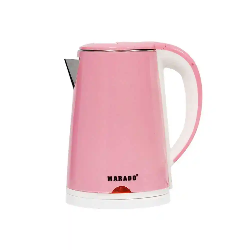 Tapa de plástico Mango y botón con material PP. Marca “MARADO”. Base de material de acero inoxidable, tetera de acero inoxidable 2.3 Litros. Dos materiales para la tapa interior, uno es de acero inoxidable y el otro es de plástico.