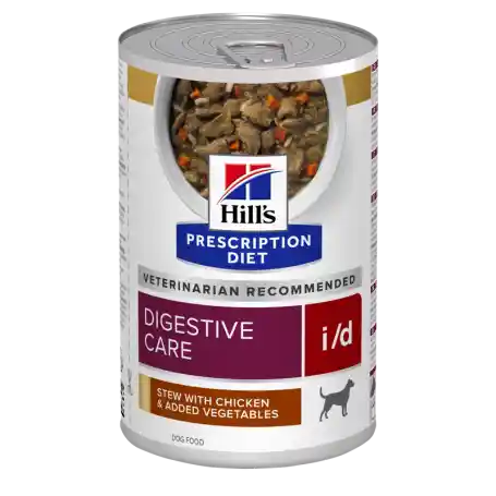 Alimento húmedo terapéutico para perros adultos con problemas digestivos, con sabor a pollo y vegetales, altamente digestible y formulado para facilitar la absorción de nutrientes. Hill’s Prescription Diet i/d Chicken & Vegetable Stew 354 g es una dieta completa y equilibrada diseñada específicamente para perros que presentan trastornos gastrointestinales, absorción deficiente de nutrientes o están en recuperación tras cirugía digestiva. Su fórmula incluye ingredientes altamente digestibles, una mezcla de electrolitos y vitaminas del grupo B para reponer nutrientes perdidos, y una proporción moderada de grasa, lo que favorece la mejora del tránsito intestinal y la calidad de las heces. Además, contiene tecnología ActivBiome+ (mezcla propietaria de prebióticos) para activar el microbioma intestinal y ayudar al bienestar digestivo. Beneficios clave: Alta digestibilidad: facilitando la absorción de nutrientes en perros con mal digestión. Reposición de nutrientes esenciales: electrolitos, vitaminas B y ácidos grasos para apoyar piel, pelaje e inmunidad. Hidratación y facilidad de consumo: formato húmedo tipo estofado de pollo y vegetales, ideal para estimular el apetito en perros con bajo consumo. Especialmente formulado para adultos, aunque puede utilizarse en casos de cachorro bajo supervisión veterinaria. Modo de uso: Consulte siempre la recomendación de su veterinario. Utilice sólo este alimento como dieta completa mientras dure el tratamiento. Mantenga agua fresca disponible en todo momento. Realice la transición al nuevo alimento en 3-7 días incrementando gradualmente la nueva fórmula para reducir el riesgo de malestar. Presentación: Lata de 354 g —ideal para tratamientos prolongados o perros de tamaño mediano/grande.