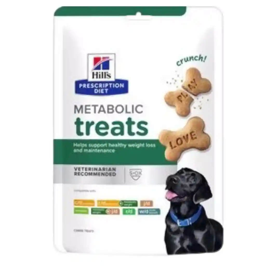 Prescription Diet Metabolic Canine Treats son golosinas sabrosas, saludables y gratificantes para perros adultos para apoyar la pérdida de peso saludable y el mantenimiento del peso. Prescription Diet Metabolic Canine Treats son un gran complemento para los perros alimentados con Prescription Diet c/d Multicare, c/d Multicare + Metabolic Weight, j/d, Metabolic, Metabolic Weight + j/d , r/d, o w/d Multi-Benefit alimento para perros. También son apropiados para todos los perros adultos y senior sanos o perros alimentados con alimento para perros Science Diet Adult Perfect Weight o Science Diet Adult Light. A tu perro le encantarán estas sabrosas galletas crujientes con forma de hueso, moderadas en calorías, proteínas y fósforo, bajas en sodio y con un alto contenido de fibra. Están diseñados para complementar muchos alimentos de Prescription Diet y, cuando se administran según las indicaciones, pueden ayudar a mantener y perder peso de forma saludable.Estas golosinas también están formuladas para ser compatibles y complementarse con los productos de Prescription Diet que tienen la S+OXSHIELD. Cómo funciona: Calorías moderadas & mayor cantidad de fibraFósforo y proteínas controlados, y bajo contenido de sodioDisfrute de golosinas sin comprometer la eficacia de los alimentos Prescription Diet Cómo ayuda: Cuando se alimentan según las indicaciones, estas deliciosas galletas crujientes con forma de hueso se tratan: Ayuda a mantener y perder peso de manera saludable Ayuda a que su perro cumpla y esté satisfecho con su régimen de peso saludable Ayuda a mantener la salud de las articulaciones cuando se alimenta con alimentos Prescription Diet designados para Mobility