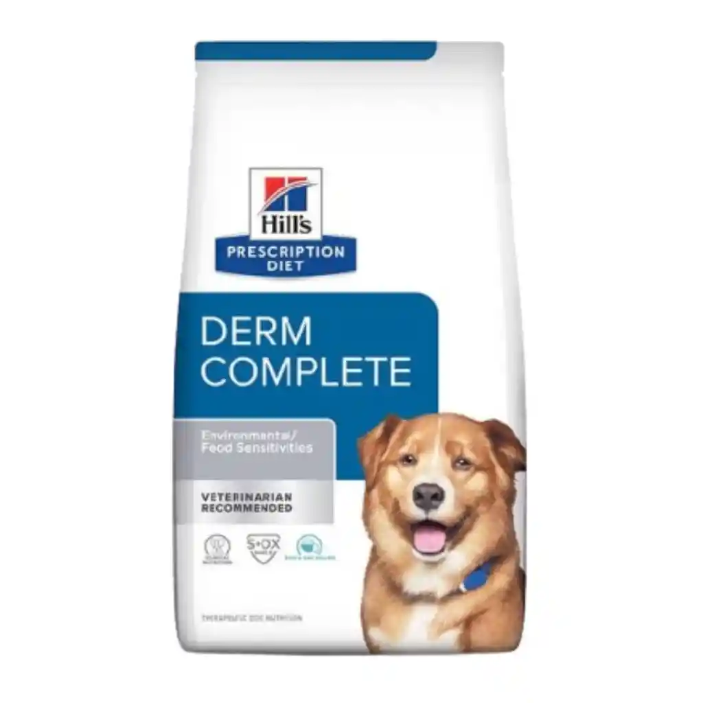 Hill's Prescription Diet Derm Complete alimento para perros es un alimento dietético completo para el mantenimiento de la función dérmica en caso de dermatosis y pérdida excesiva de pelo y para la reducción de la intolerancia a ingredientes y nutrientes en perros adultos. Este alimento tiene altos niveles de ácido linoleico (LA) y de la suma de ácido eicosapentaenoico (EPA) y ácido docosahexaenoico (DHA), así como un número de fuentes de proteínas y de hidratos de carbono seleccionado y limitado. Beneficios Clave Protección cutánea: reduce picor y mejora la calidad del pelaje en 21–28 días Fuente proteica única: proteína de huevo, ideal para evitar reacciones alimentarias Histaguard™: mezcla de antioxidantes y fitonutrientes que refuerzan la inmunidad Omega‑3 y‑6: favorecen la salud dérmica y el brillo del pelaje S+OXSHIELD: protege el tracto urinario contra cálculos Composición y Análisis Garantizado Ingredientes clave: arroz integral, arroz cervecero, producto de huevo, concentrado de proteína de arroz, aceite de pescado, linaza, arándanos, brócoli, pulpa de remolacha Proteína bruta: ≈ 17 % Grasa bruta: ≈ 15 % Fibra bruta: 1.2–1.4 % Omega‑3: ≥ 1.6 %, Omega‑6: ≈ 3.6 %