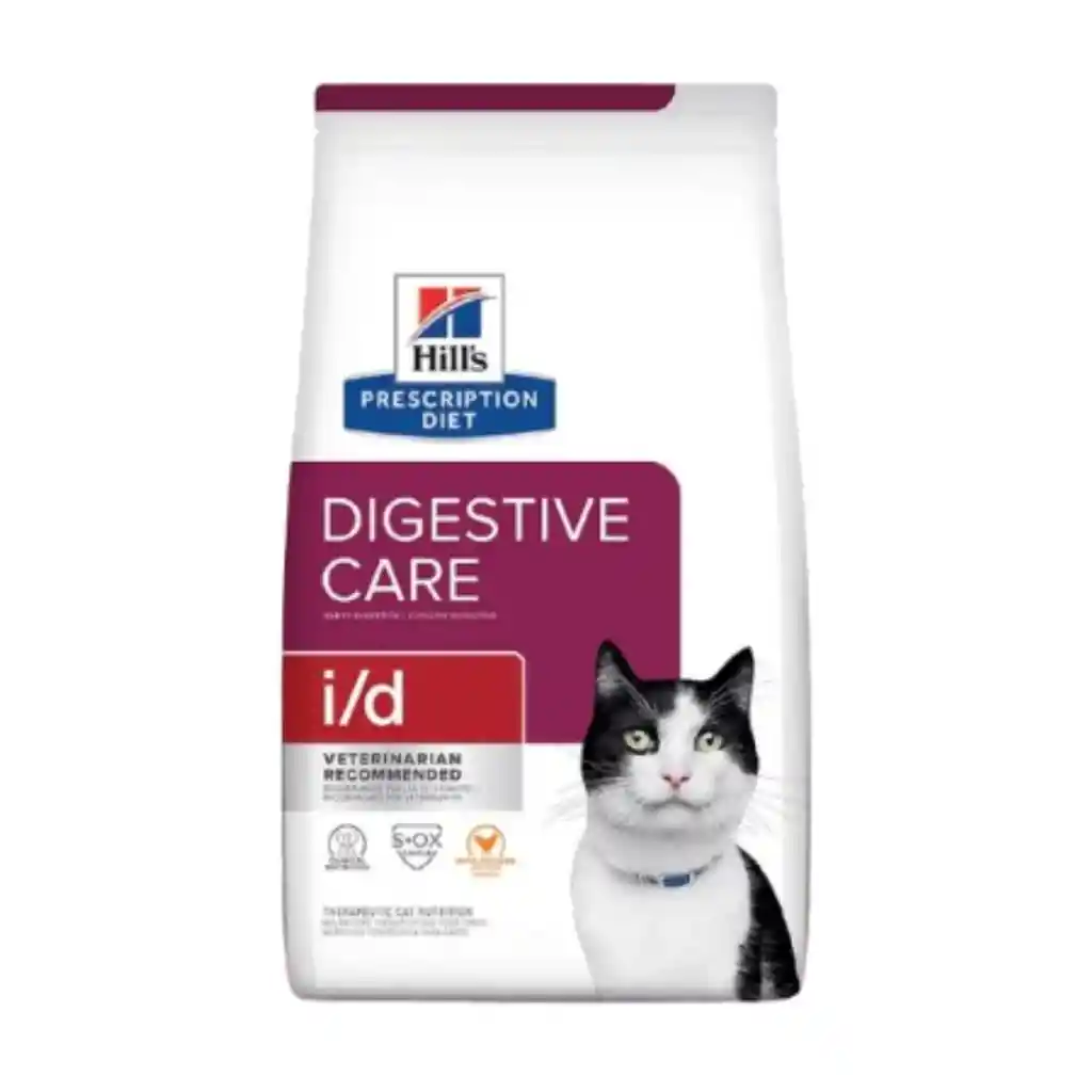 HILL'S PRESCRIPTION DIET, I/D DIGESTIVE CARE, 1.81 KG, es un alimento seco para gatos, altamente digerible que favorece la fácil absorción de nutrientes, con fibra prebiótica, que ha demostrado clínicamente que ayuda a calmar los trastornos digestivos de tu gato favoreciendo las bacterias intestinales beneficiosas, además de promover heces sanas y mejorar la digestión. Alto en electrolitos y vitaminas B; antioxidantes clínicamente comprobados. Contiene ácidos grasos omega 3 y 6. Satisface las necesidades nutricionales especiales de gatitos, hembras en gestación y lactación, gatos adultos y gatos senior, promoviendo un sistema inmunológico saludable y, está elaborado con pollo para otorgarle un sabor irresistible a tu gato. INGREDIENTES: Pollo, cebada perlada partida, harina de gluten de maíz, grasa de pollo, arroz cervecero, producto de huevo, maíz integral, harina de pollo, sabor a hígado de pollo, ácido láctico, sulfato de calcio, pulpa de remolacha deshidratada, cloruro de potasio, cloruro de colina, fructooligosacáridos (FOS) , vitaminas (suplemento de vitamina E, suplemento de niacina, mononitrato de tiamina, L-ascorbilo-2-polifosfato (fuente de vitamina C), pantotenato de calcio, suplemento de vitamina A, suplemento de riboflavina, biotina, clorhidrato de piridoxina, suplemento de vitamina B12, ácido fólico, vitamina Suplemento D3), taurina, DL-metionina, sal yodada, L-lisina, cáscara de semilla de psyllium, minerales (sulfato ferroso, óxido de zinc, sulfato de cobre, óxido de manganeso, yodato de calcio, selenita de sodio), tocoferoles mixtos para la frescura, sabores naturales, Óxido de Magnesio, Betacaroteno.
