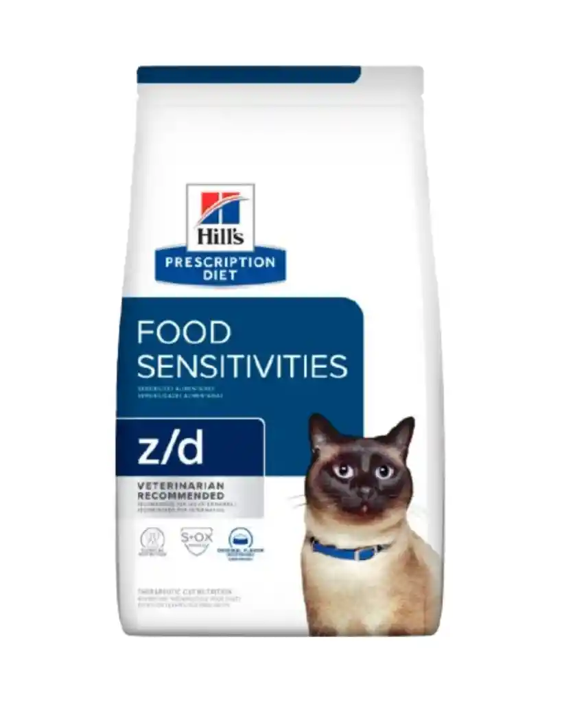 Hills Z/D food sensitive para gatos, es un alimento recomendado en el manejo de reacciones adversas a alimentos (alergias o intolerancia) y para trastornos gastrointestinales. El Hills Z/D food sensitive, es útil en el manejo nutricional del gato con enfermedad inflamatoria intestinal. Beneficios Una sola proteína animal altamente hidrolizada y una fuente única de carbohidratos. Sin proteína de soya, lactosa ni colorantes o saborizantes artificiales. Minerales controlados para la salud de la vejiga. Formulado para ayudar a mejorar la digestión y la calidad de las heces. Ayuda a eliminar las causas de la irritación cutánea relacionadas con el alimento. Ayuda a favorecer un sistema inmunológico sano. Ingredientes Arroz de cerveceros. Hígado de pollo hidrolizado. Concentrado de proteína de arroz. Celulosa en polvo. Aceite de soja. Aceite de coco. Sabor a hígado de pollo. Carbonato de calcio.