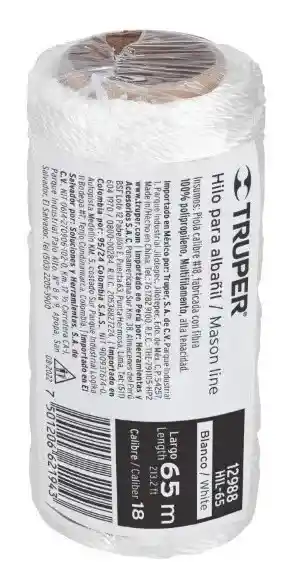 Carrete con 65 m de hilo para albañil blanco marca Truper. Caracteristicas: - Compuestos por hilo de 3 cabos de 5,040 deniers - Hilos de polipropileno multifilamento - Sirve para manualidades, pesca y albañilería