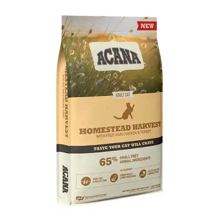 Acana Homestead Harvest Cat es un alimento completo para gatos adultos formulado con ingredientes naturales, regionales y frescos para crear recetas biológicamente apropiadas a la alimentación de tu gato adulto y así aportarle las proteínas que necesita. Su principal ingrediente es una gran fuente de proteínas formada por pollos y pavos en libertad, además de huevos de corral y pato, que les proporcionan una buena salud visual y cardíaca. Estos ingredientes junto con el hígado liofilizado potencian el sabor del pienso convirtiéndose en un alimento irresistible para tu gato.