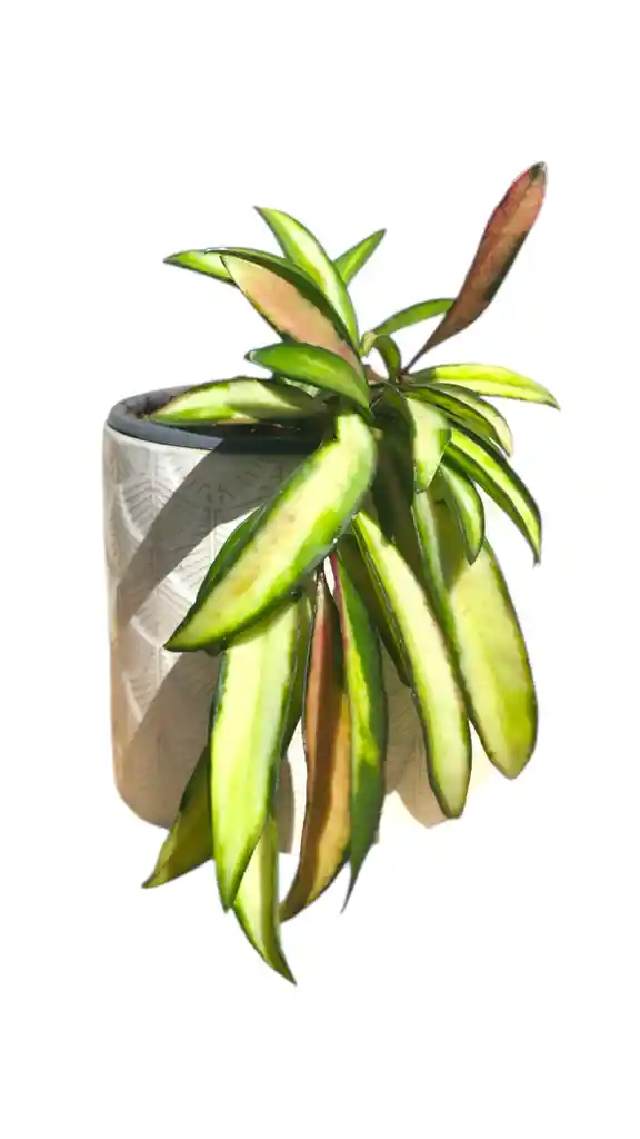 Hoya Wayetti Variegada. \n \nLa Elegancia de la Flor de Cera Multicolor. \n \nAñade un toque exótico y coleccionable a tu espacio con la Hoya Wayetti Variegada, una impresionante variedad de la popular "Flor de Cera". Esta planta, apreciada por sus hojas alargadas y su colorido único, es perfecta para quienes buscan una planta de interior elegante y de fácil cuidado que, con el tiempo, recompensa con hermosas flores. \n \n¿Por qué la amarás? \n \nFollaje Tricolor Único: Lo que distingue a la Hoya Wayetti Variegada son sus hojas lanceoladas y alargadas. A lo largo del borde, presentan una llamativa variegación de color crema, verde lima e incluso toques rosados cuando se expone a la luz adecuada. La parte central mantiene un verde más oscuro, creando un contraste espectacular. \n \nTextura Cárnea y Brillante: Las hojas de esta hoya son gruesas y suculentas, lo que le permite retener agua y ser muy tolerante a la sequía. Su acabado ceroso y brillante le da un aspecto pulido y saludable. \n \nHábito de Crecimiento Versátil: Con un crecimiento rastrero o trepador, es una excelente opción para cestas colgantes donde sus enredaderas caerán elegantemente. También puede ser guiada para trepar por un tutor, creando un punto focal interesante. \n \nGuía Rápida de Cuidados: \n \nLuz: Si quieres que tu hoya florezca y mantenga estos increíbles colores, además de un Sustrato Semi-epifito Planta Calma, debes otorgarle una muy buena iluminación (siempre protegida de un visillo). \n \nRiego: Es importante dejar secar la primera capa del sustrato antes de regar. \n \nHumedad: Lo ideal para todas las plantas tropicales tener un 60% de humedad como promedio. \n \nTip Plantlovers: ¡A ella le encanta trepar y enrollar sus tallos, crecerá más feliz y rápido! \n \n \nNo es tóxica, es Petfriendly 🐶🐱