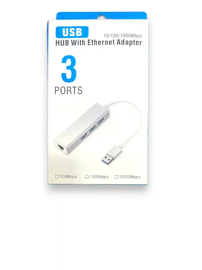 Hub USB con 3 puertos USB y entrada Ethernet, que permite conexión a red cableada de hasta 1000 Mbps. Ideal para notebooks y PCs que requieren ampliar puertos y mejorar la estabilidad de internet.