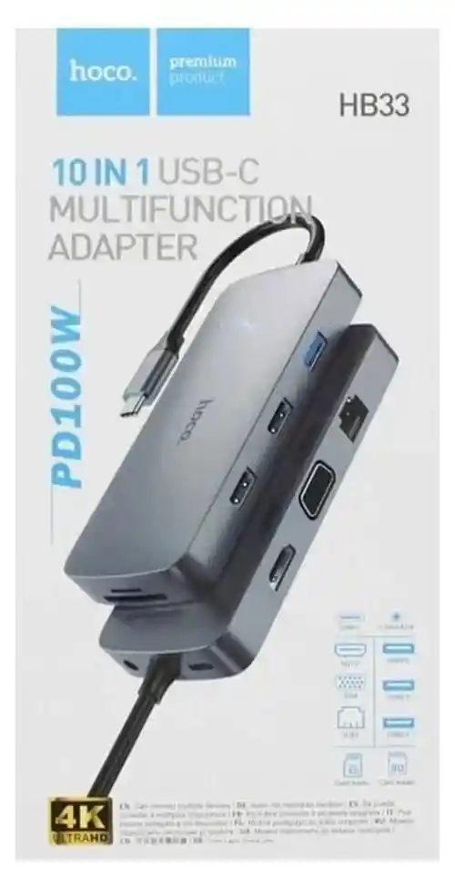 Adaptador HUB USB-C 10 en 1, el cual incluye las siguientes conexiones;HDMI+USB-C+USB 3.0 + USB2.0*2 + SD + TF + RJ45 (ETHERNET) + VGA + AUX 3.5