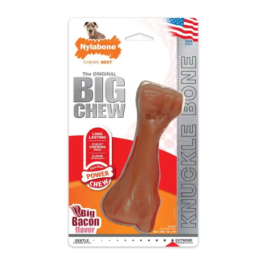 <p><img alt="" src="Nylabone.jpg?$staticlink$" title="" width="100%" /></p> <p> Durante más de 60 años, Nylabone ha estado proporcionando los mejores juguetes masticables para perros para mantener a los amigos peludos felices y entretenidos mientras satisfacen su impulso natural de masticar. Diseñado para los masticadores más grandes, el juguete Power Chew Knuckle Bone BIG es prácticamente indestructible. Este duradero juguete para masticar está fabricado con resistente nylon de larga duración y cuenta con robustos extremos masticables para satisfacer a los masticadores más extremos. Ofrece a los perros una forma de hueso familiar y cuenta con delicioso sabor en todo, añadiendo a la emoción de masticar. Además, este hueso para perros fabricado en EE.UU. ayuda a limpiar los dientes y a refrescar el aliento de su mejor amigo. Los juguetes masticables Nylabone están recomendados por veterinarios y están hechos para resolver una gran variedad deproblemas de masticación.</p><p> VIRTUALMENTE INDESTRUCTIBLE</p><p> - El juguete de nylon de larga duración resiste a los masticadores más extremos EXCITANTE FORMA DE HUESO</p><p> - Divertido juguete para masticar diseñado con una auténtica forma de hueso y mantiene a los perros felices, ocupados, Y SATISFECHOS DESALIENTA LA MASCADA DESTRUCTIVA</p><p> - El diseño duradero fomenta hábitos saludables de masticación APOYA LA SALUD DENTAL DEL PERRO</p><p> - Ayuda a limpiar los dientes y refrescar el aliento mientras los perros mastican USA MADE</p><p> - El juguete para masticar para perros está orgullosamente fabricado en los Estados Unidos PARA PERROS XX-LARGE</p><p> - El juguete para masticar Size Monster está diseñado para perros de más de 50 libras SABOR DELICIOSO EN TODO</p><p> - El sabroso juguete para masticar para perros tiene un gran sabor a tocino al que los amigos peludos no se pueden resistir</p>