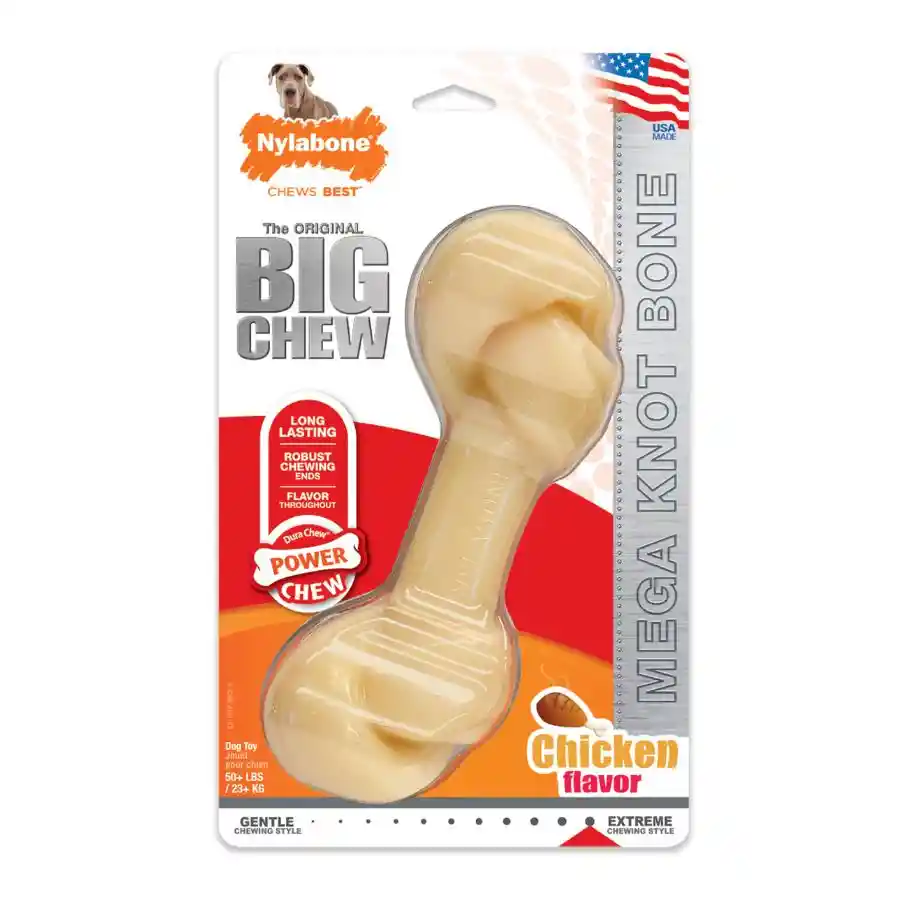 <p><img alt="" src="Nylabone.jpg?$staticlink$" title="" width="100%" /></p> <p> Desde 1955, Nylabone ha estado proporcionando los mejores juguetes masticables para perros para mantener a los amigos peludos felices y entretenidos mientras satisfacen su impulso natural de masticar. El juguete masticable Power Chew Mega Knot Bone BIG es la solución perfecta para los masticadores más grandes y extremos. </p><p> Este juguete masticable prácticamente indestructible está hecho del material más resistente de Nylabone y cuenta con extremos masticables robustos para mantener a los perros desafiados, fomentando hábitos de masticación saludables en el camino. Este divertido juguete masticable para perros también se parece a un hueso de nudo real y ofrece un delicioso sabor en toda su superficie.</p><p> Orgullosamente fabricado en los EE.UU., el Mega Knot Bone ayuda a limpiar los dientes mientras los perros mastican para promover una<br /> sonrisa feliz ysaludable. Los juguetes masticables Nylabone están recomendados por veterinarios y están hechos para resolver una gran variedad de problemas de masticación.</p><p> VIRTUALMENTE INDESTRUCTIBLE</p><p> - Hueso de nylon de larga duración con extremos masticables robustos que resisten a los masticadores más grandes y extremos.</p><p> PARECE UN HUESO DE NUDO REAL</p><p> - Hueso masticable para perros creado con una forma familiar y que mantiene ocupados a los amigos peludos.</p><p> DESALIENTA LA MASCADA DESTRUCTIVA</p><p> - Diseño duradero que fomenta hábitos masticatorios saludables.</p><p> APOYA LA SALUD DENTAL DEL PERRO</p><p> - Ayuda a limpiar los dientes mientras los perros mastican.</p><p> USA MADE</p><p> - Juguete masticable para perros fabricado con orgullo en los Estados Unidos.</p><p> PERROS GRANDES</p><p> - Tamaño Monster juguete para masticar está destinado a perros 50 + + libras</p><p> SABOR DELICIOSO EN TODAS PARTES</p><p> - sabroso juguete para masticar perro cuenta con sabor a pollo peludos amigos no pueden resistir</p><p> DIMENSIONES CHEW TOY: Fuera del paquete mide 7" de largo x 2 " de ancho x 1.75" de alto</p>