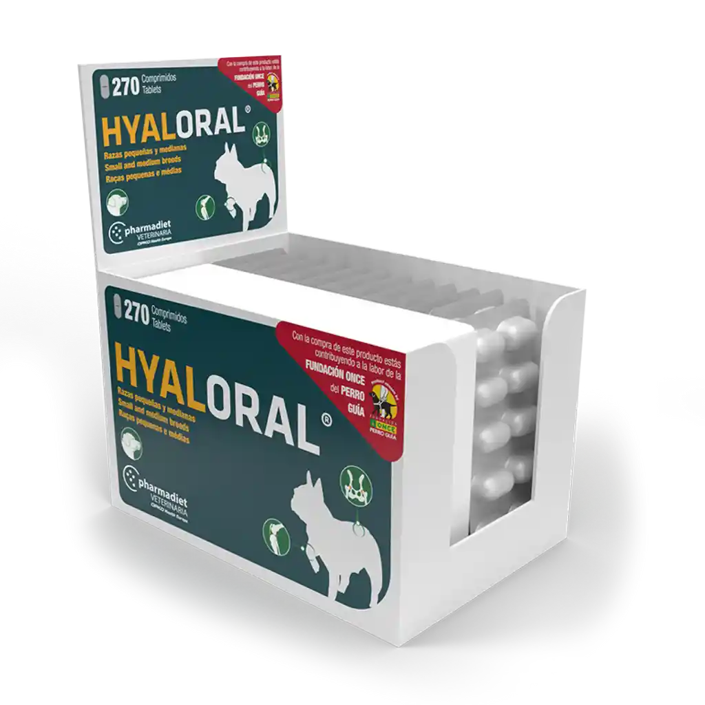 Condroprotector para perros suplementario que contribuye al desarrollo y mantenimiento de articulaciones, tendones y ligamentos. Una fórmula completa que añadida a la dieta habitual cuidará la salud articular de su mascota. Indicaciones: -Favorecer desarrollo articular. -Prevención de lesiones. articulares en caso de predisposición hereditaria, y sobrecarga articular (Displasia de cadera y codo). -Regeneración del cartílago hialino y lubricación articular. -Reducción de procesos inflamatorios (Artritis y Artrosis). -Mejorar movilidad de la articulación post cirugías o inmovilización articular prolongada. -Condromalacia Patelar o Rotuliana ( Desgaste del Cartílago o tejido Blando que protege la articulación) -Fortalecimiento de tendones y ligamentos. Composición: -Colágeno Hidrolizado Enzimáticamente: Componente mayoritario y base estructural del cartílago hialino de las articulaciones. -Ácido Hialurónico: Principal componente del líquido sinovial. Favorece la nutrición del cartílago. -Condroitin Sulfato: Principal glucosaminoglicano de la matriz extracelular del cartílago. Nutriente que contribuye al mantenimiento del correcto funcionamiento de la articulación. -Glucosamina: Amino azúcar que contribuye al mantenimiento del correcto funcionamiento de la articulación. -Gamma Orizano: Sustancia de origen natural que muestra una potente acción antioxidante. Sin Proteína de Pollo, Sin Granos, Sin Conservantes, Sin Lactosa, Máxima Palatibilidad, efectividad clínicamente comprobada. Formato: 1 Blister: 10 comprimidos, 1 comprimido para 5 kilos de peso. 3 Blister para 1 mes de tratamiento para un perrito de 5 kilos. 6 Blister para 1 mes de tratamiento para un perrito de 10 kilos.