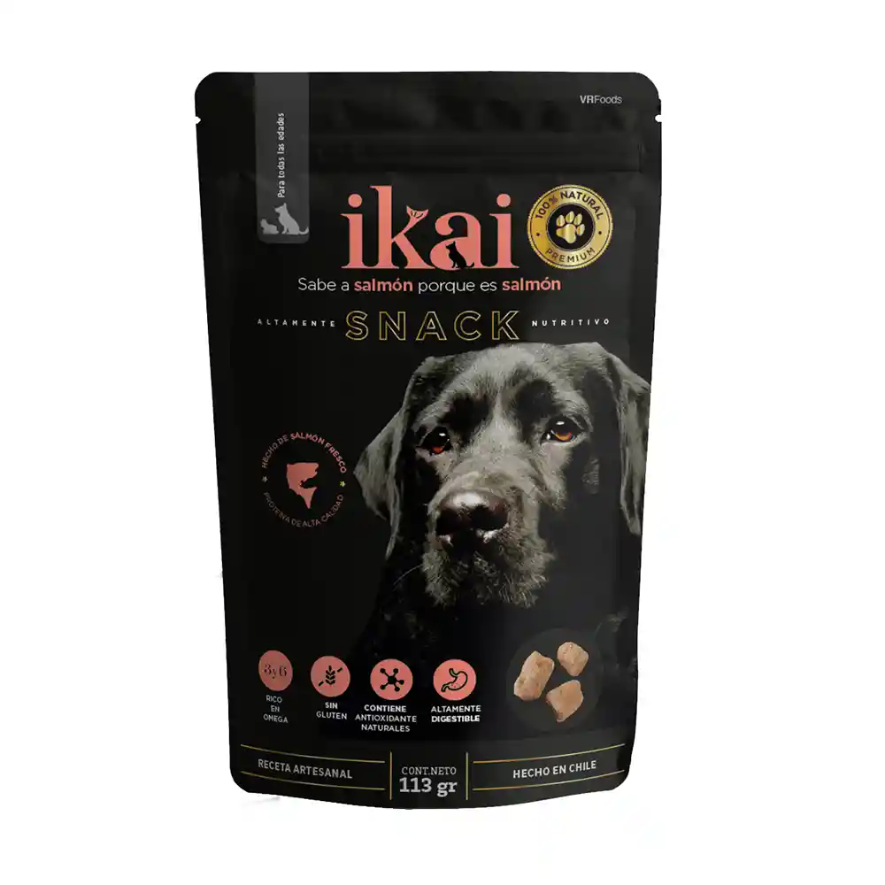 Snack para perro IKAI “Una opción sana, nutritiva y sabrosa para tu compañero” Con más de 30 años de experiencia en el rubro salmonero chileno, contando con una materia prima inigualable en cuanto a sus características y viendo el rápido e importante crecimiento del mercado de mascotas, comienzan con el desarrollo de snacks de alta calidad nutricional para mascotas Características: Snack de SALMÓN: Hecho 70% de salmón fresco del sur de Chile Producto 100% NATURAL: NO contiene preservantes artificiales, ni saborizantes. NO contiene GMO ́s LIBRE de gluten: Lo que ayuda a NO irritar el sistema digestivo de tu mascota. Rico en OMEGA 3 y OMEGA 6: Lo que ayuda al sistema inmunológico, reduce problemas del corazón, mejora la piel y pelaje de tu mascota. Contiene un antioxidante natural. ● Snack deshidratados, su humedad es de 12% ● Es para todas las edades, etapas y razas ● Ayuda al tránsito intestinal ● Viene en una bolsa autosostenible (doypack) con cierre hermético.