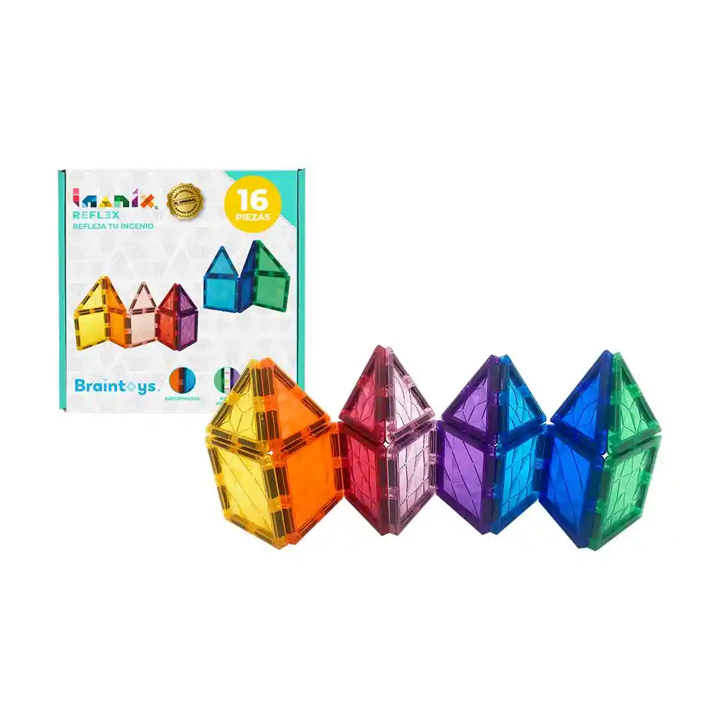 Juego de construcción Imanix réflex 16 piezas magnéticas, llega para hacer brillar tu juego. Gracias a los cortes y relieves que tienen cada uno de los bloques imantados, las piezas reflectan la luz e iluminan las creaciones en 2D y 3D. Los productos Imanix promueven que niños de todas las edades (3 años en adelante) jueguen durante horas, mientras desarrollan distintas habilidades, estimulan el cerebro y aumentan su concentración. Cada pieza tiene imanes incrustados en sus bordes permitiendo fácil adherencia. Fomenta el desarrollo social, cognitivo y lógico, explorando las primeras nociones vinculadas al lenguaje, las matemáticas, las artes y las ciencias, al ser un verdadero estímulo para la actividad cerebral y coordinación visomotora. Todas las piezas están fabricadas de plástico no tóxico. Cuenta con certificado Tolueno y EN-71. Creados para personas de 3 a 99 años. Compatible con toda la línea IMANIX.