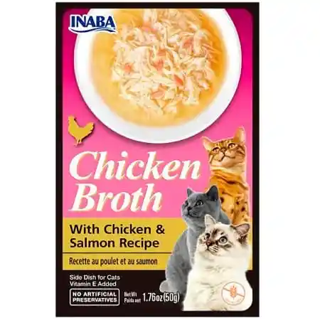 El Inaba Chicken Broth Salmón es un delicioso complemento para la alimentación de tu gato. Este producto está hecho con un caldo de pollo 100% natural y añade suculentos trozos de pollo y salmón para darle un sabor irresistible. Es una excelente manera de mantener hidratado a tu gato, ya que contiene un 93% de humedad. Úsalo como complemento para la comida, como topper para alimentos húmedos/secos o simplemente como una deliciosa golosina. Contiene: 50 gramos
