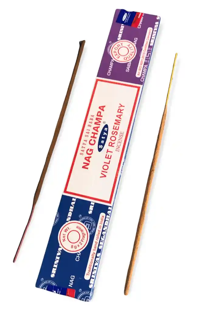 Dentro de la caja, se separa por dos contenedores de la cual vienen : - 8 varitas de Nag Champa: El clásico aroma de Nag champa esta echo de Sandalo puro con mezcla de flores de champa. Ideal para la meditación, relajación, paz, mejora el estado de animo, humor y la energía ambiental. - 8 Varitas de Violet Rosemary: Protege contra los malos espíritus. Nos conecta con la suerte y el amor.
