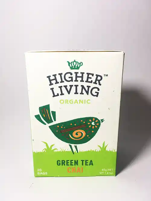 Infusión Té verde Chai. Mezcla de especias que combina hojas de té verde con cardamomo, canela, clavo de olor y cáscara de naranja. 100 % Orgánico. La caja contiene 20 bolsitas. Origen: Inglaterra.